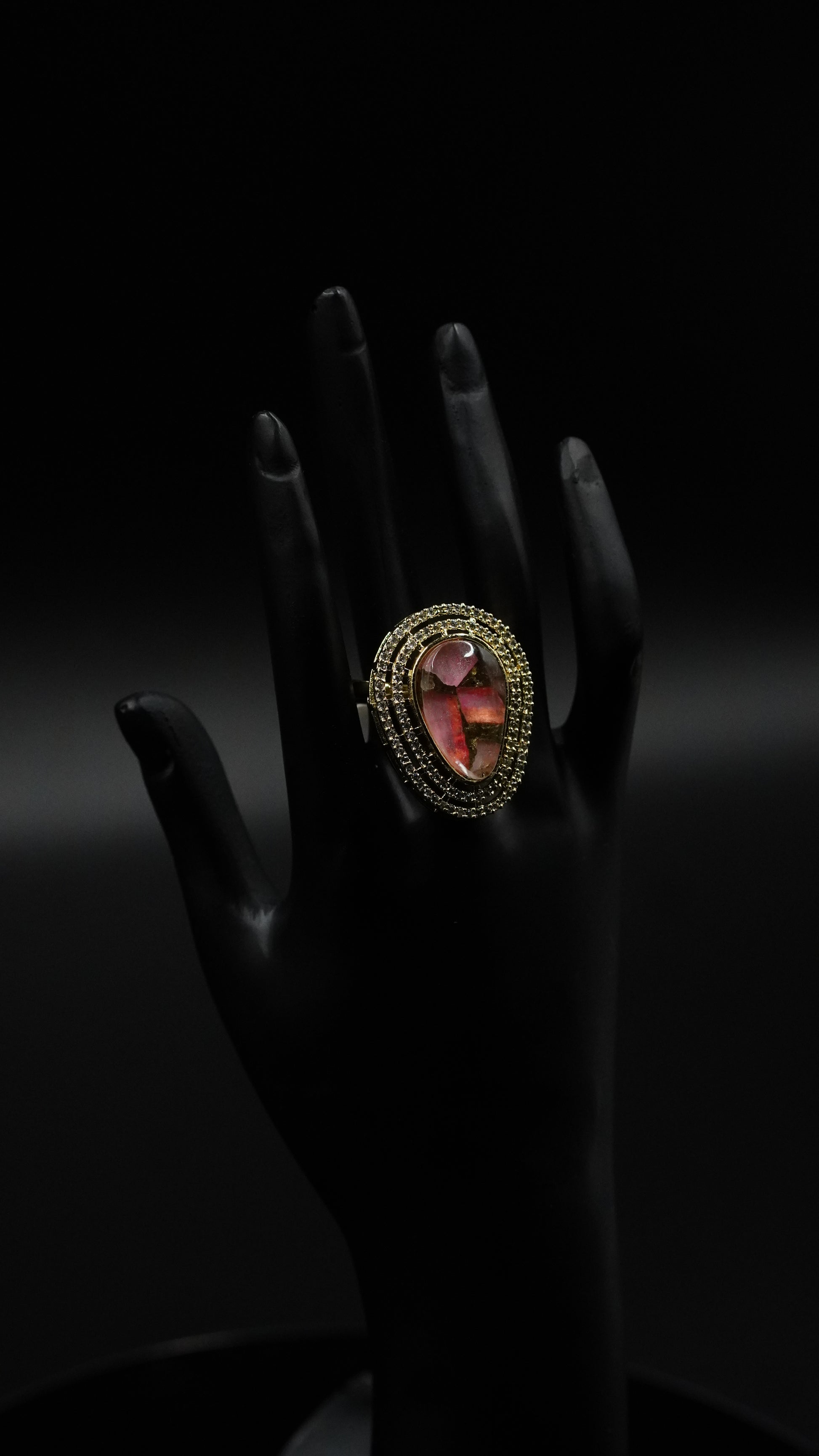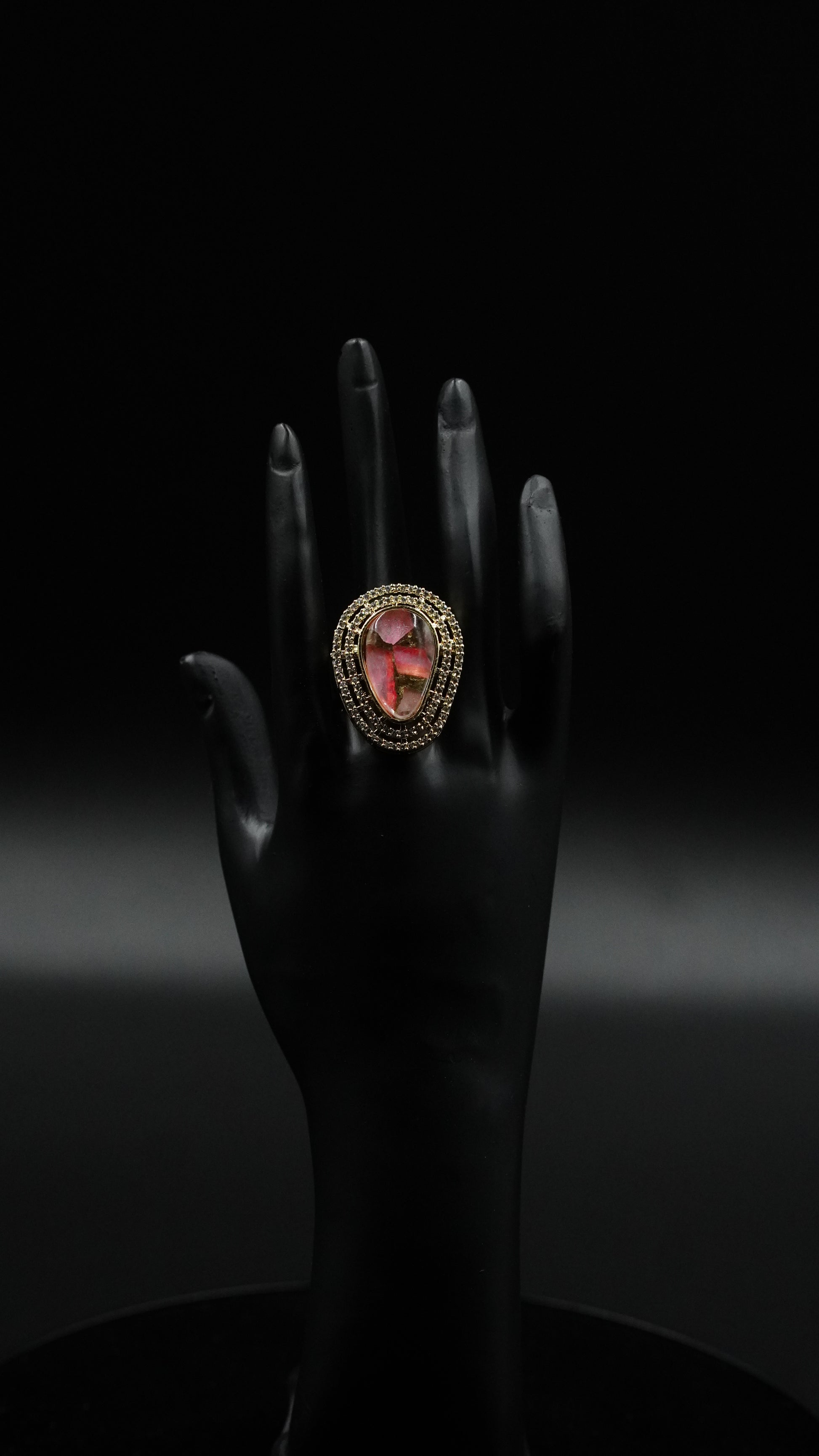 Step into the spotlight with the Mystic Flame Teardrop Ring, an enchanting statement piece designed to captivate. At its heart lies a glowing teardrop gemstone with fiery tones of rose and amber, encased in a double halo of shimmering crystals for maximum brilliance. Its unique organic shape and radiant finish make it the perfect blend of bold artistry and timeless elegance.