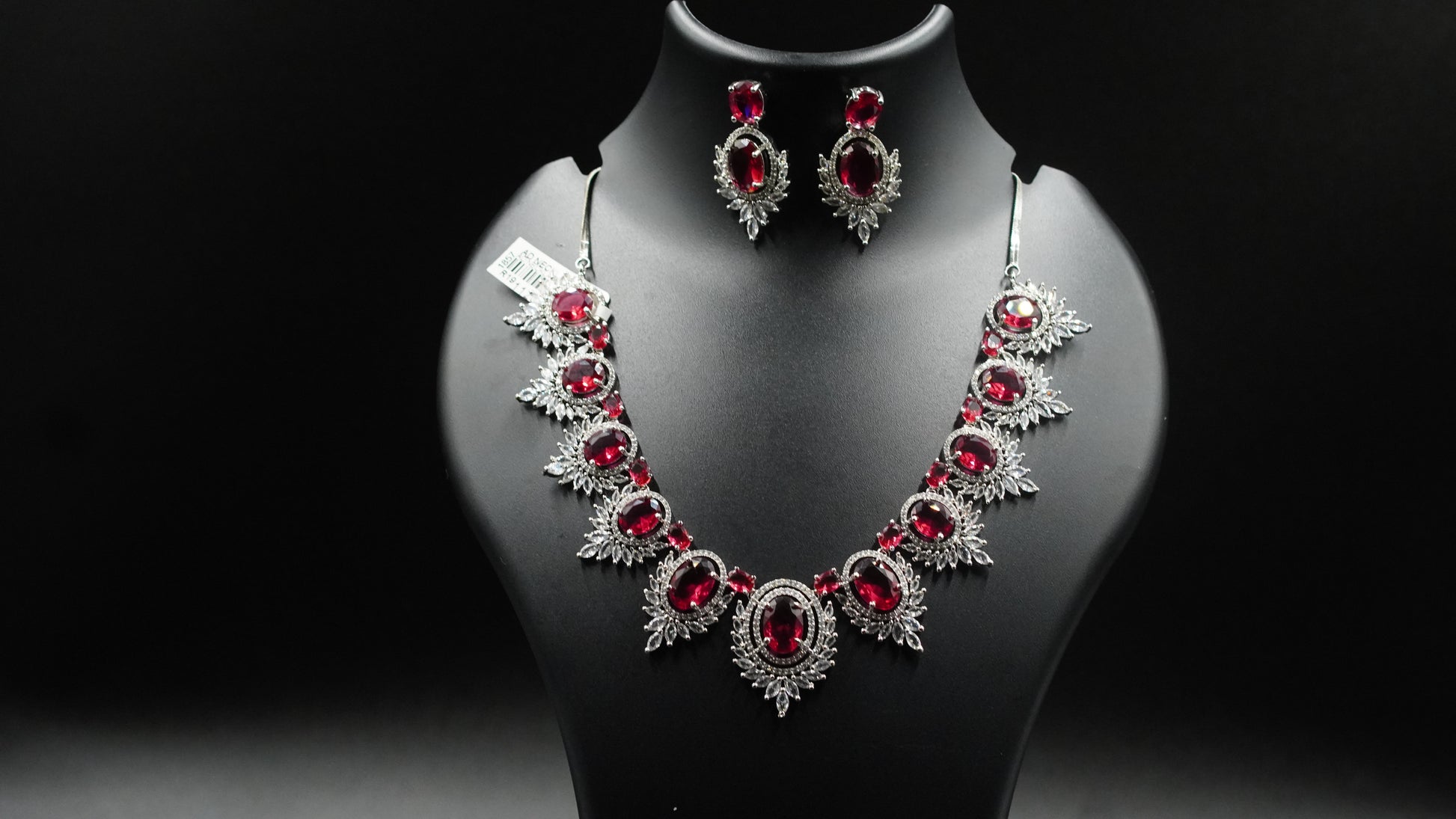 Make an unforgettable statement with our Regal Ruby Bridal Set – a timeless masterpiece crafted for the modern bride. This luxurious set features a meticulously designed necklace, matching chandelier earrings, and a radiant statement ring, each centered with deep crimson stones and framed by dazzling crystal accents. The intricate detailing and royal silhouette echo traditional elegance with a contemporary flair.
